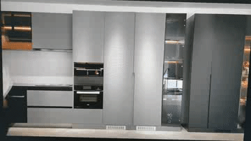 第二种是比较复杂的“全嵌入式橱柜一体冰箱”。其特点是可以根据家装的整体风格给冰箱定制和橱柜一样的面板,这样从外观上完全看不到冰箱,左右和上下看不出一点缝隙,整体感更强,更美观。但是需要根据各品牌各型号冰箱的尺寸和散热技术,在橱柜中预留相应的散热通道,所以需要家装的设计阶段就需要考虑好相关问题。
