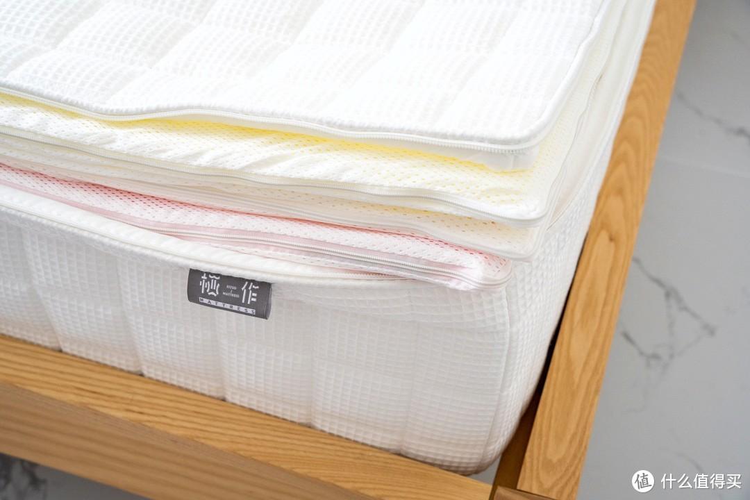 拆开之后可以看到裸感π的三层填充层:2cm支撑护脊海绵、2cm邓禄普工艺乳胶、3cm柔睡释压棉,三层填充层均使用独立袋装,上下层之间可以自由调整,一共能呈现6种不同的睡感。