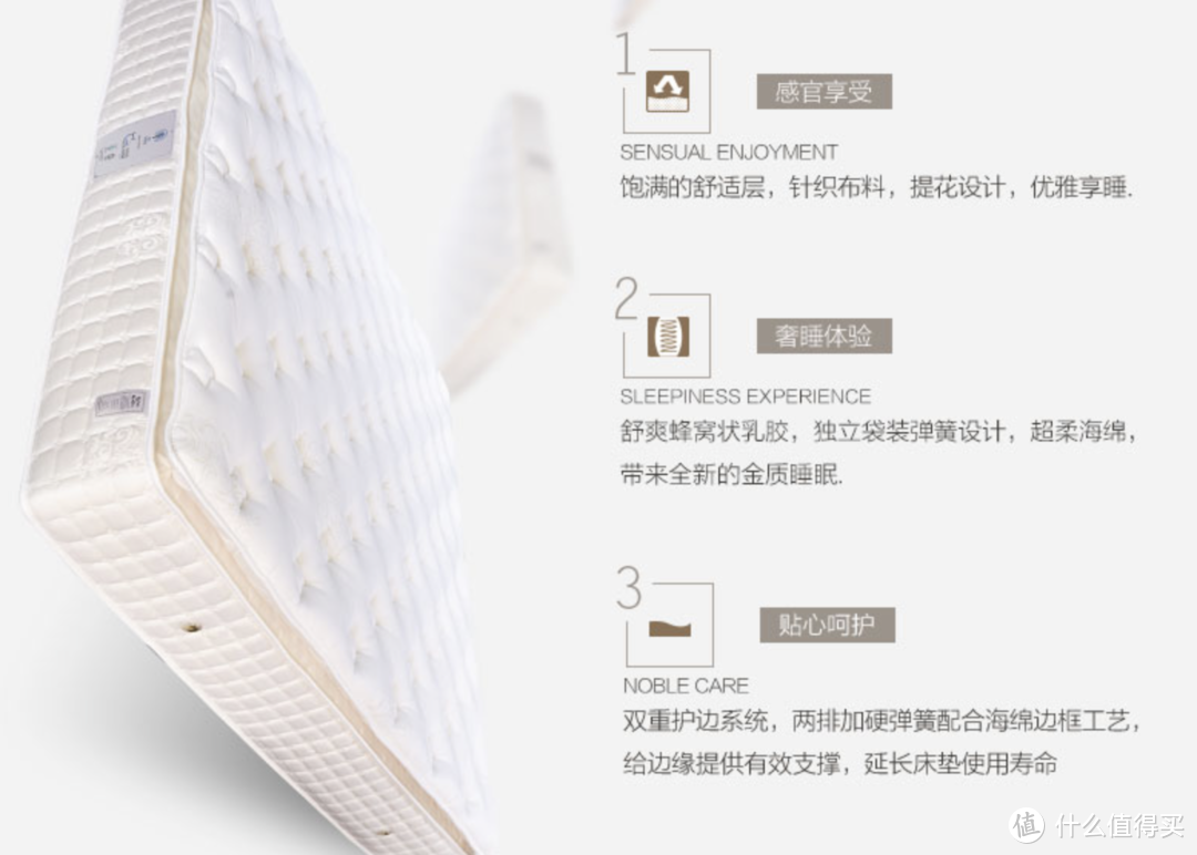虽然当时不太懂,但除了价格贵一些也不算是踩坑,娜莎的配置还是很豪华的,尤其是填充层很厚,包括乳胶层、超柔海绵,表面材质和定制弹簧的品质也好,整体睡感偏软,包裹感十足 。