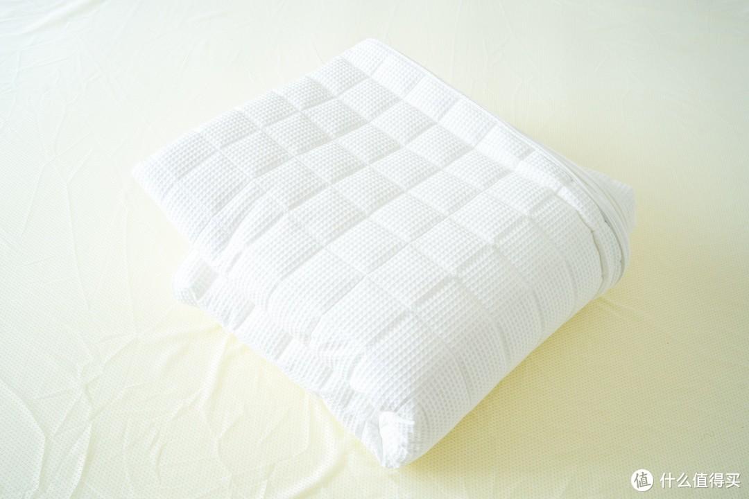 这款床垫在设计方面吸引我的有两点,第一点就是表面采用方形纹理A类华夫格面料,视觉上很精致,触感也舒服,类似酒店浴袍的感觉。