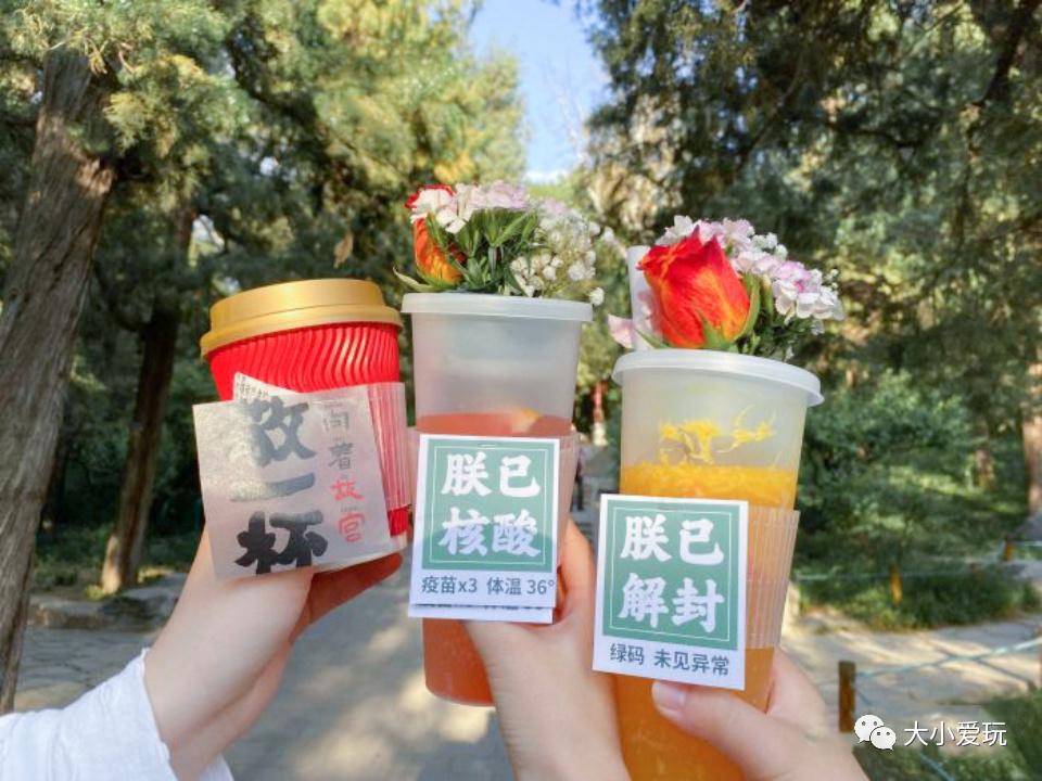 现在买饮料,还能选一个特制杯套,“朕已核酸”、“朕已疫苗”、“朕已解封”、“向着故宫敬一杯”,紧跟热点,还玩得这么有创意,不大卖都说不过去。