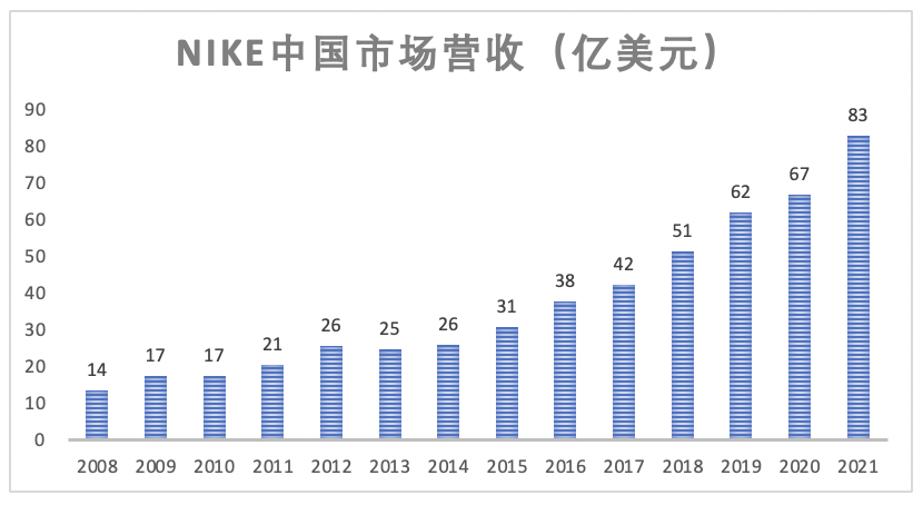 社交品牌的大幅滑落,运动品牌反而是受益者,就连“新疆棉事件”爆发的2021年,一度喊疼的Nike也都是大幅度增长的,年销售83亿美元,约500多亿人民币,稳居中国市场第1名;