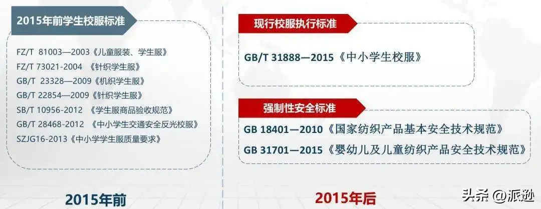 针对我国校服长期以来存在的监管不到位、校服标准多而不精和协调性不强等问题,经教育部、标准委等有关部门多次协调会,2015年颁布并实施专门针对中小学生校服产品的标准GB/T 31888-2015《中小学生校服》。在校服“新国标”的要求下,校服产品不再仅有等级划分、不止设立一档准入门槛,而是有了与色牢度、水洗尺寸变化率、起毛起球、色差、布面疵点、对称部位互差等一般性能相关的更高要求,与现行服装同类标准的一等品要求相当。