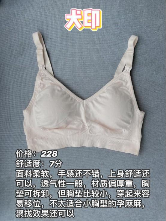 面料柔软,手感还不错,上身舒适还可以,透气性一般,材质偏厚重,胸垫可拆卸,但胸垫比较小,穿起来容易移位,不太适合小胸型的孕麻麻,聚拢果还可以
