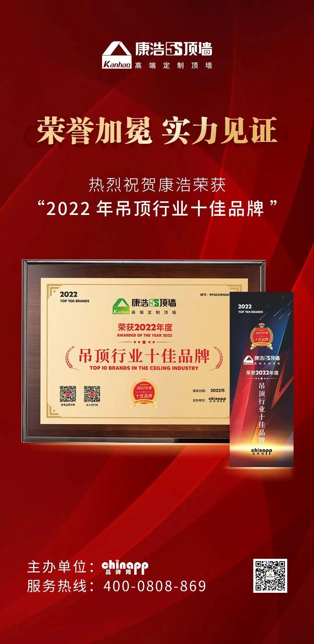 由家居建材行业知名平台,品牌网公布的“2022年吊顶行业十大品牌“,康浩5S顶墙凭借着品牌自身的实力与市场的良好口碑,连续第二年荣耀上榜,斩获“2022吊顶行业十佳品牌 ”殊荣。