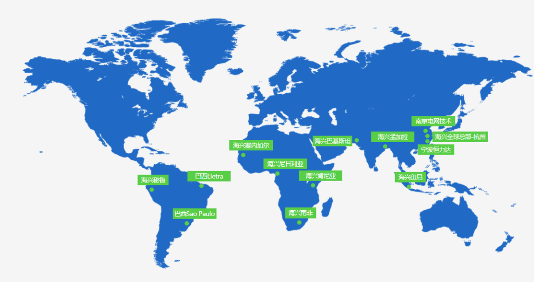 海兴电力采用化生产布局,拥有杭州、宁波、南京3大国内生产基地;拥有巴西、印尼、南非等海外生产基地。在国内设立省办以及在海外设立地区部和代表处的形式,构建了覆盖的营销平台,实现了LTC(从线索到回款)销售全流程可视化管理。