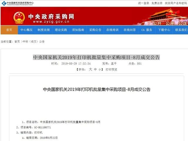 日前,中央政府采购中心公布了《中央2019年打印机批量集中采购项目-8月成交公告》,整个8月份打印机集采项目包由三个打印品牌瓜分,分别是奔图、京瓷和富士施乐。