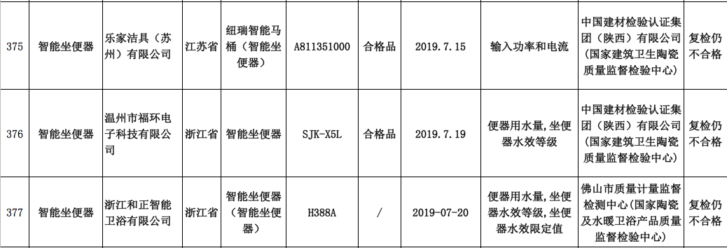 根据通报,乐家洁具(苏州)有限公司生产的“纽瑞”智能马桶(规格型号:A811351000,生产日期:2019/7/15)输入功率和电流不合格;温州市福环电子科技有限公司生产的智能坐便器(规格型号:SJK-X5L,生产日期:2019/7/19)涉及便器用水量、坐便器水等级不合格;浙江和正智能卫浴有限公司生产的智能坐便器(规格型号:H388A,生产日期:2019/07/20)则存在便器用水量,坐便器水等级,坐便器水限定值不合格情况。