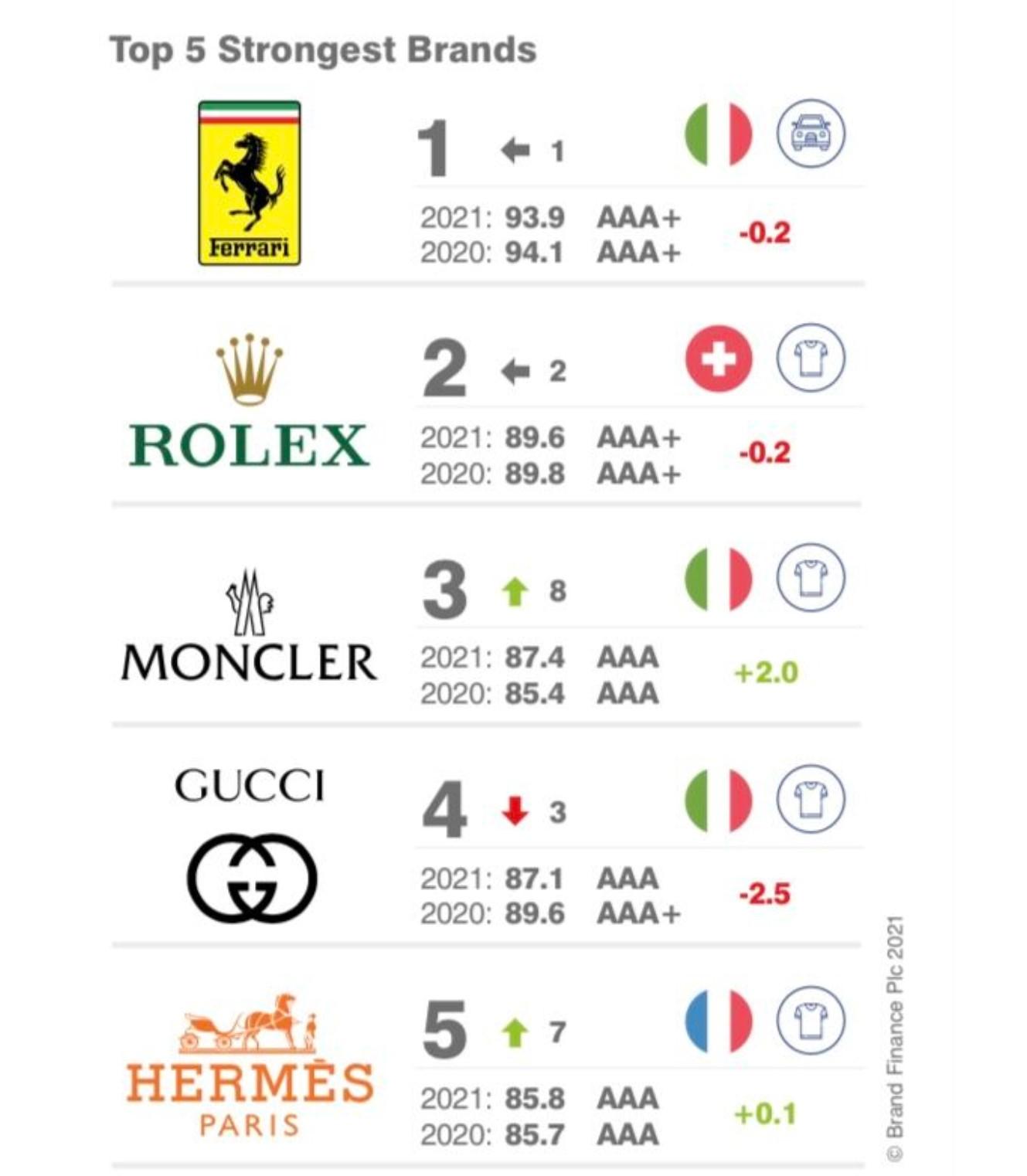 在榜单的一个关于品牌力量的分榜单中,前五位是法拉利、劳力士、盟可莱、古驰、爱马仕,令人意外的是盟可莱的快速崛起。