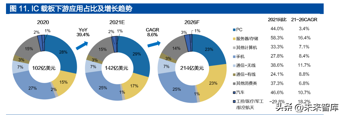 从下游应用来看,PC、服务器、消费电子、通信应用合计占比 95%,服务器/存 储用高性能计算及存储芯片对载板需求是未来主要增长动力。2021 年 PC(高 性能 CPU/GPU,42 亿美元,29%)仍是第一大主流应用,手机(SoC/射频, 36 亿美元,25%)、服务器/存储(高性能处理器/存储,24 亿美元,17%)、其 他消费类(21 亿美元,15%)紧随其后,前四大应用合计占据 86%的份额,此 外通信(有线+无线,13 亿美元,9%)也占据一定份额。未来预计 PC 由疫情 居家带来的高增长出现回落,消费电子(手机+其他)回归平稳,服务器/存储类 芯片对于载板的需求将成为主要驱动力,无线侧通信及汽车也将有略高于平均的 增速。