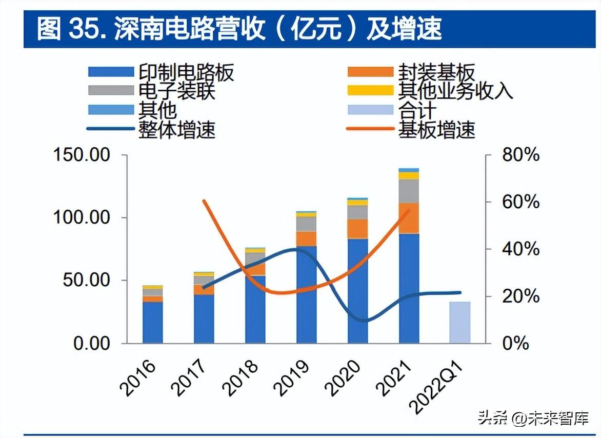 深南电路是内资领先的 PCB 龙头厂商,主要涉及印制电路板、 封装基板及电 子装联三大业务,形成了独特的“3-In-One”业务布局。公司 2009 年进入半 导体封装基板领域,形成具有自主知识产权的封装和工艺,已成为日月光、安靠 科技等封测巨头的合格供应商。2021 年公司整体营收为 139.43 亿元,同比增 长 20%,归母净利润 14.8 亿,同比增长 3%,毛利率 23.71%,同比-2.76pcts。 IC 载板业务营收达到 24.15 亿元,占比 17.3%,同比增长 56%,远超整体;近 两年公司 IC 载板毛利率逐步爬升至 29.09%,较整体高出 5.38pcts,已成为重 要的收入及利润贡献来源。