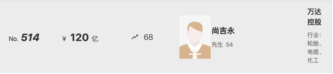 万达控股尚吉永拥有财富120亿元,在2022年百富榜排名514位,同比上升了68位。