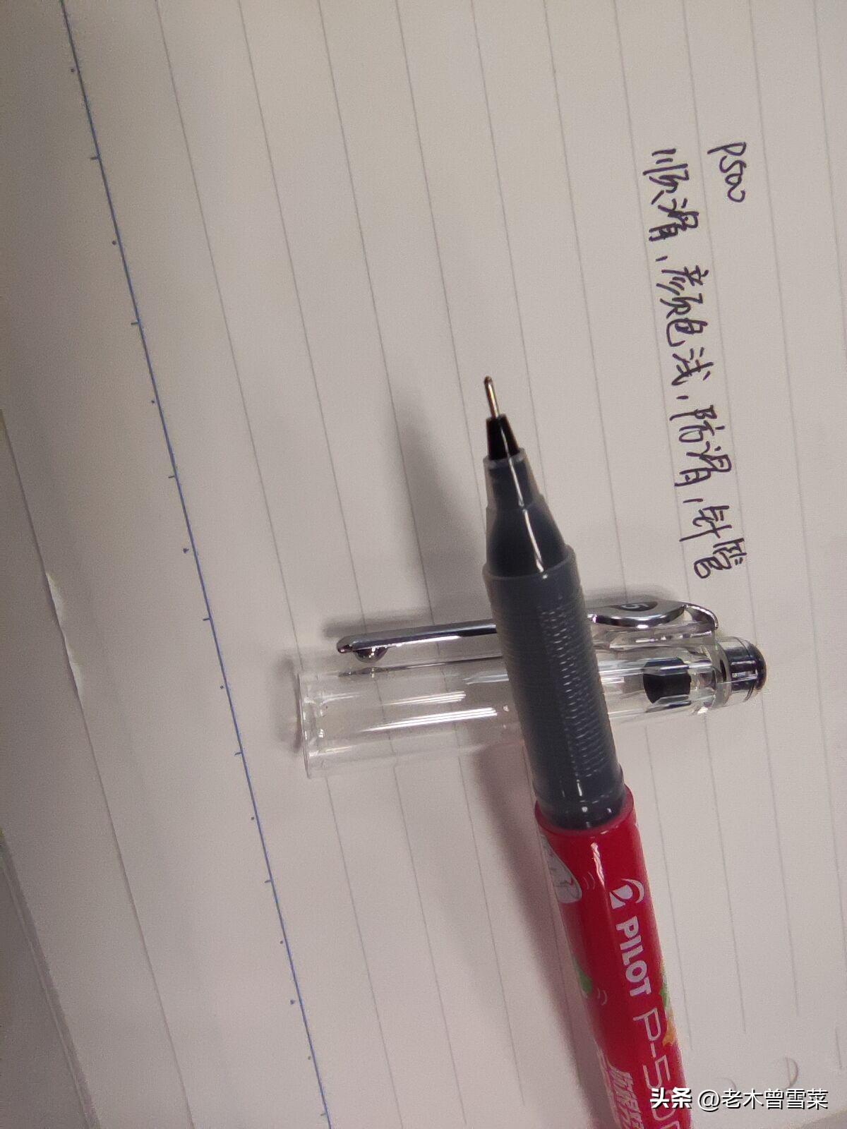 百乐P500针管中性笔,P500搭载三点承托针管笔,墨水速干,书写顺滑,标准0.5mm粗细,搭配学校卷面用纸好用,有刷题的快乐感,不追求细字的针管笔,百乐P500用起来。不过P500不能换替芯,墨水存在笔杆里,用完就寿命到了终点。(推荐价格:5元左右/支)
