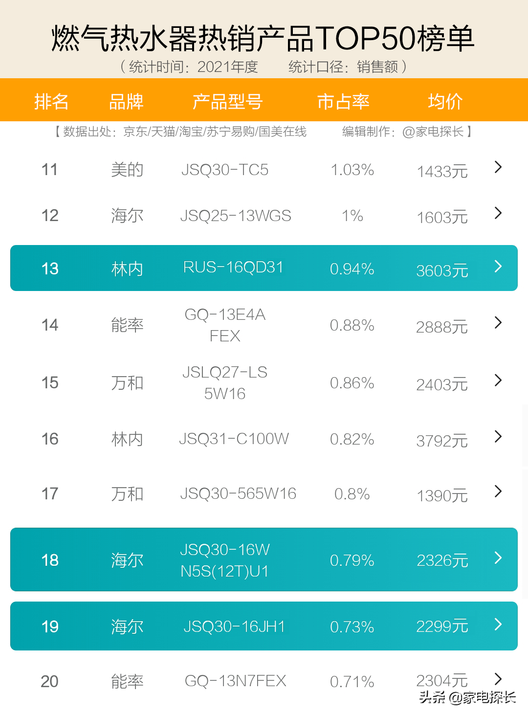 2021年度,5大线上渠道按销售额统计,燃气热水器TOP50热销机型,海尔上榜12个,美的12个、万和8个、林内6个、AO史密斯5个、能率3个、万家乐2个,其它品牌2个。