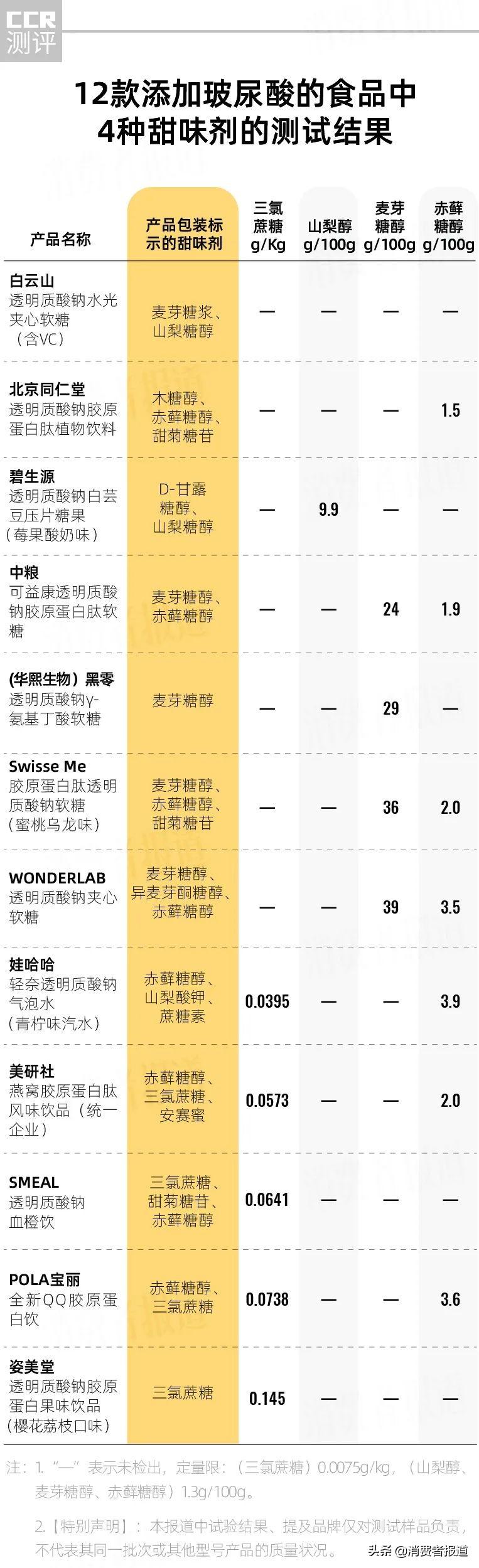 此次本刊选择了口服玻尿酸中的三氯蔗糖、山梨醇(山梨糖醇)、麦芽糖醇和赤藓糖醇四种主要的甜味剂进行检测。结果显示,仅白云山没有检出上述任何甜味剂。该款产品宣称添加了山梨糖醇一种代糖,而山梨醇的结果显示为“未检出”。原因可能有两种: