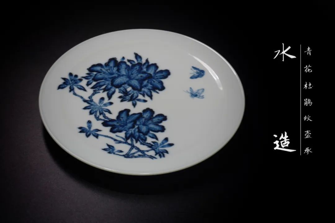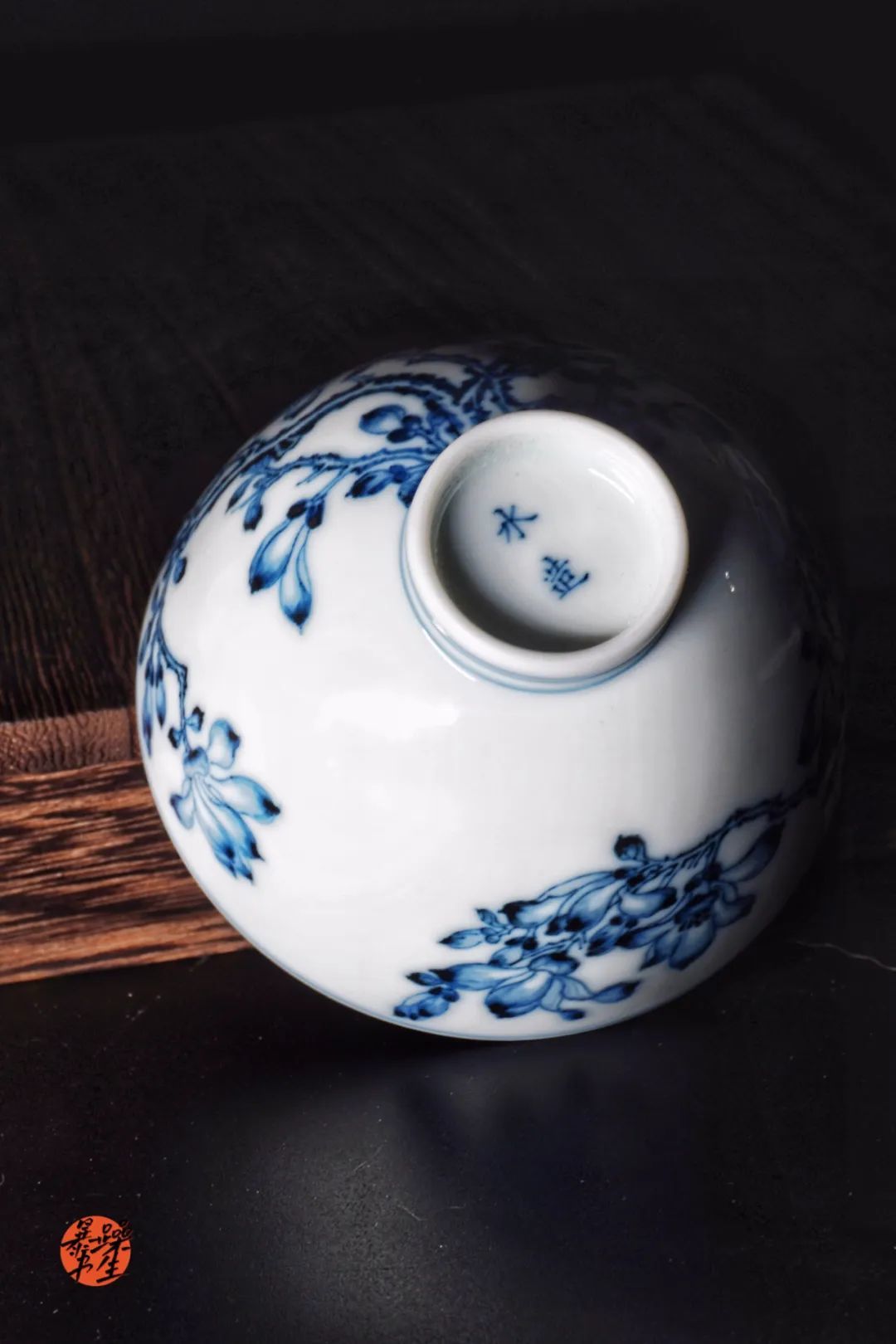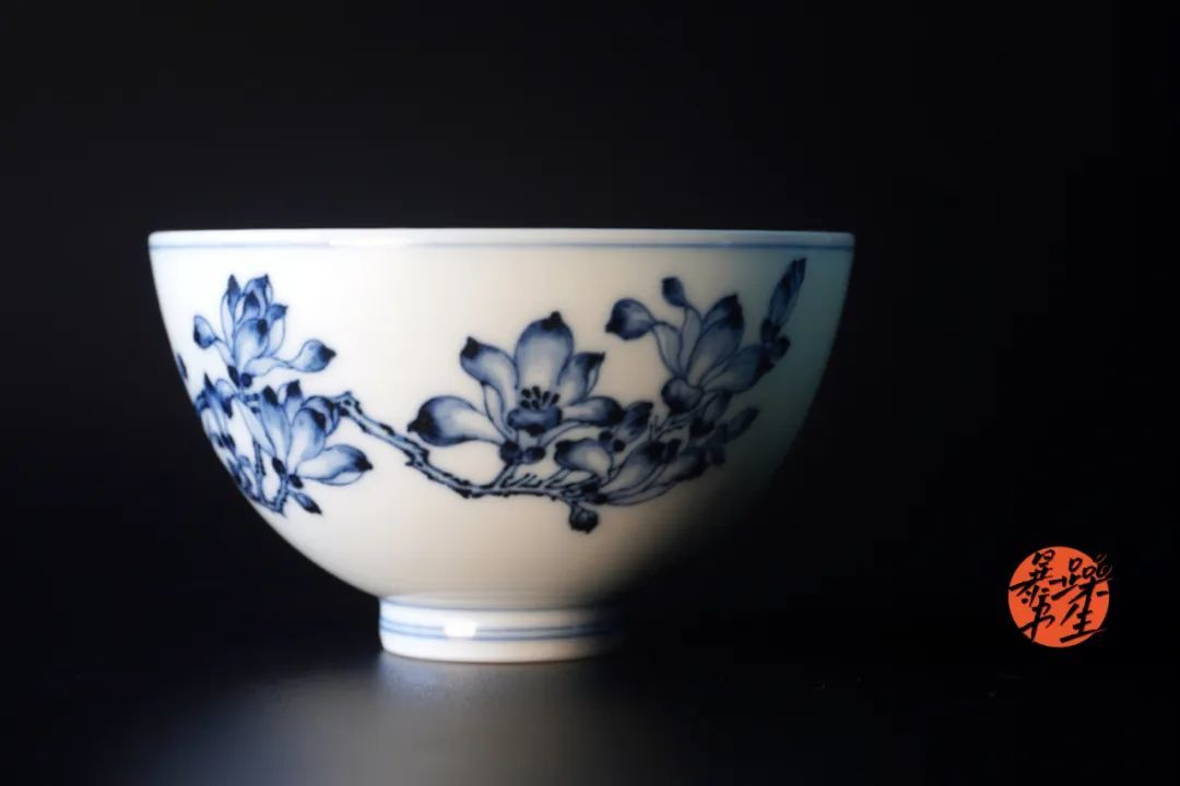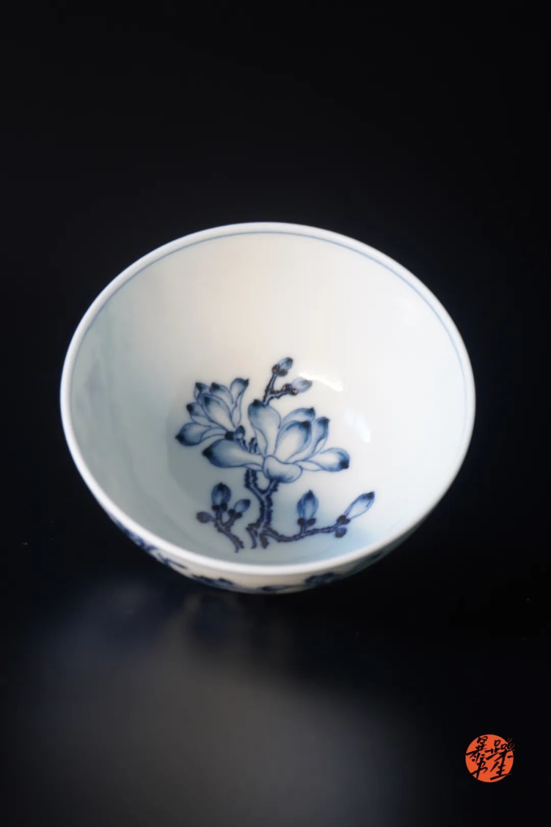 水造将它作为主题绘于杯上,这件玉兰花鸡心杯,同样证明了清新淡雅的玉兰与柔和的青花有着很高的相性。