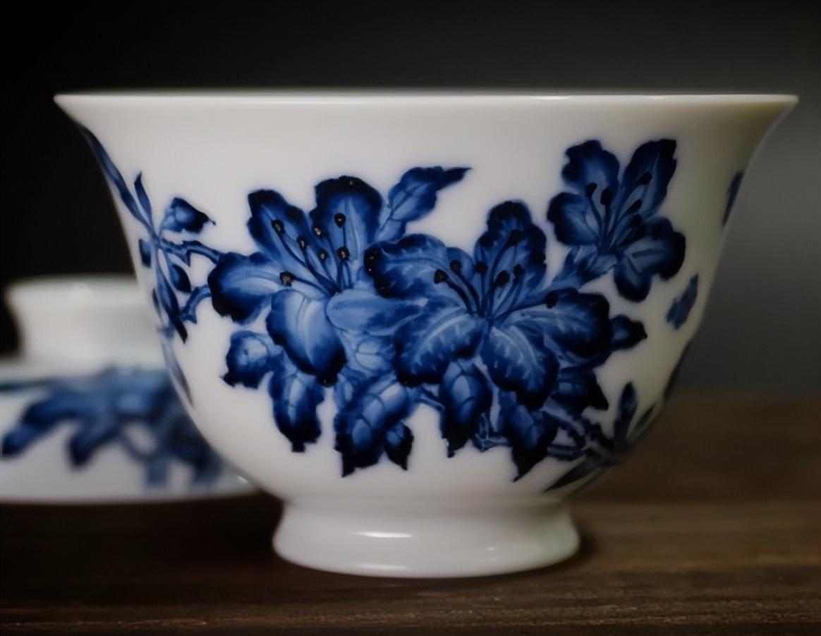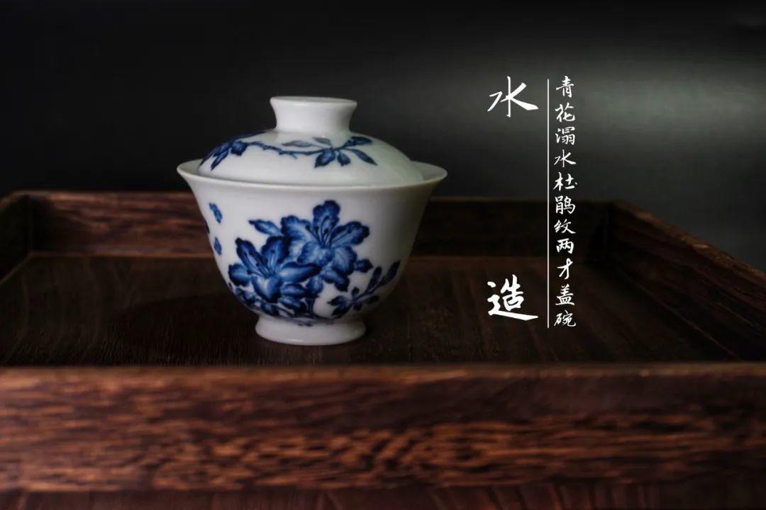 两才盖碗,器型利落饱满、大气端庄,撇口、鼓腹、外八小圈足,曲线流畅雅致,称手更称心。盖碗的外腹壁、盖面皆绘有杜鹃花,一蓝绽万彩,将“明式美学”展现得淋漓尽致;