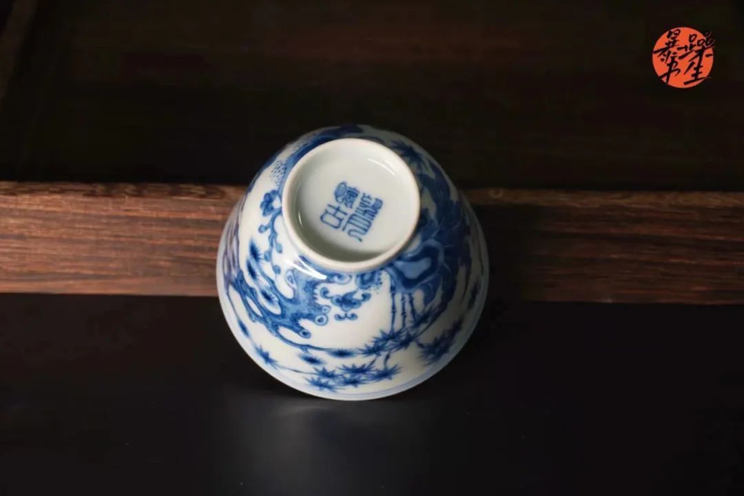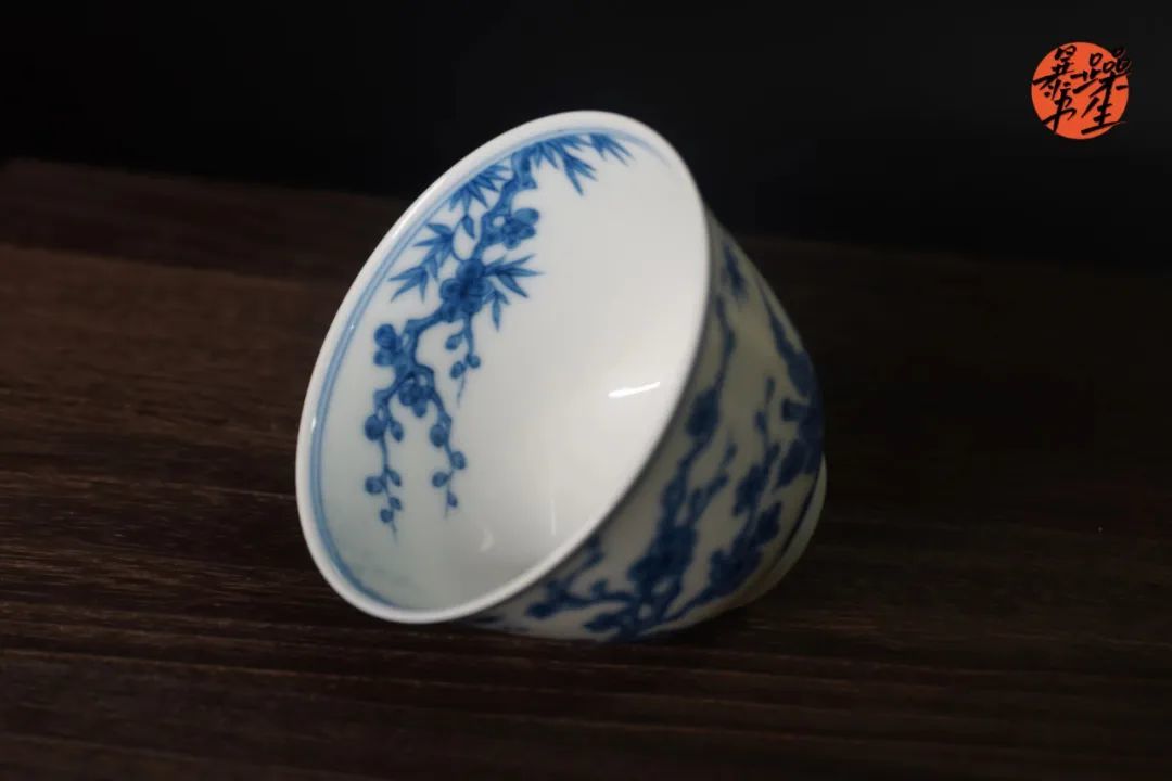 将这釉质莹润肥厚的杯身缓缓展开,就是一幅充满诗意的岁寒三友图。