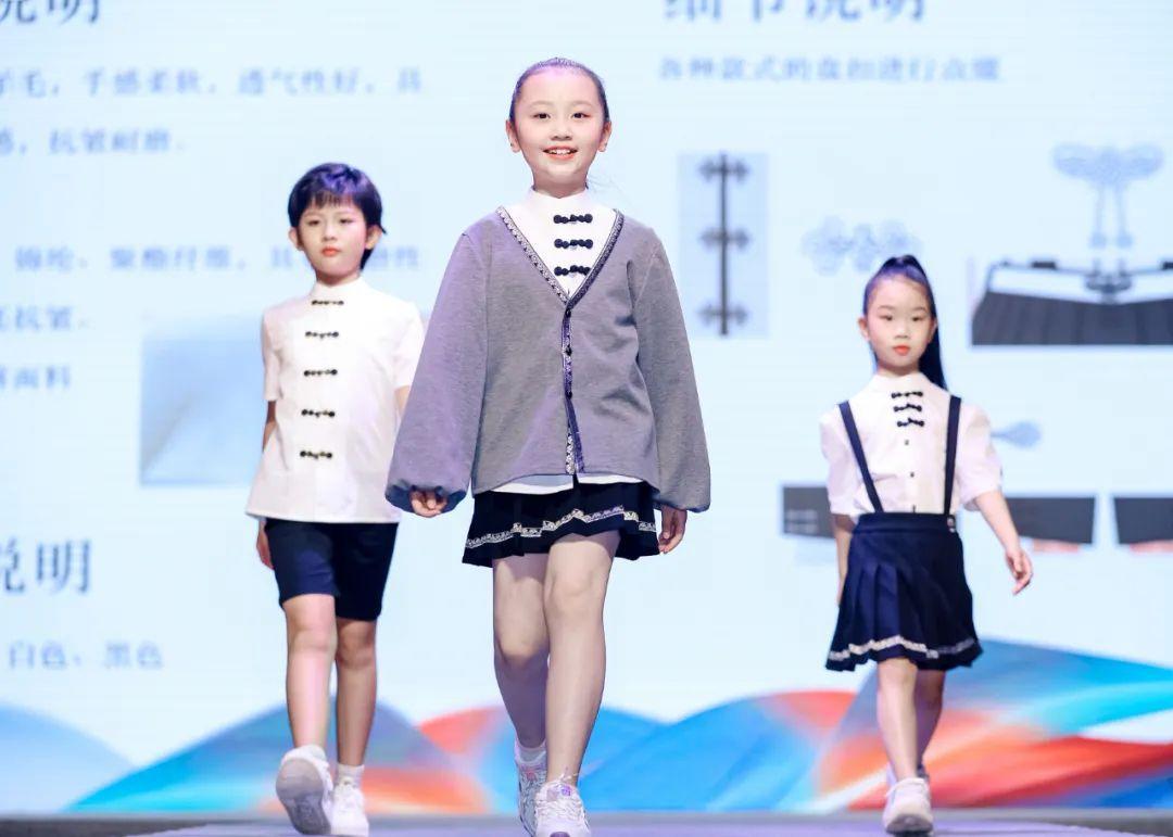 决赛现场,20组来自上海工艺美术职业学院、云南轻纺职业学院、东华大学等院校学生的入围作品制作为成衣,由小模特们穿上走秀展示,给观众带来的视觉体验。作品《锦绣前程》将苗族特色盛装“百鸟衣”纹样与传统校服相结合,用刺绣手法融入太阳纹、螺旋纹等几何纹样,在灯光的照射下熠熠闪光,巧妙契合“日月生辉”的寓意。
