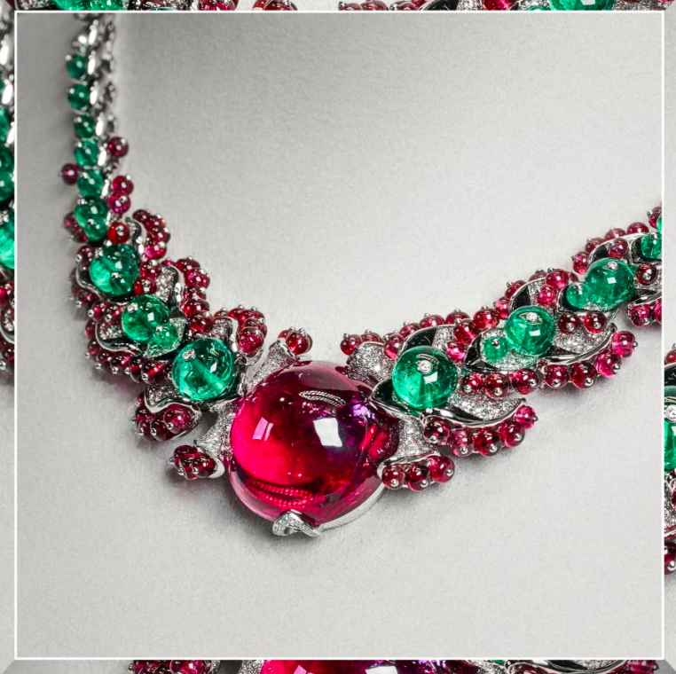 至今,卡地亚也仍然喜欢祖母绿+红宝石,近的 Sixième Sens 高珠系列中就让它们再次亮相,Delectation 项链中的祖母绿和红宝石交相辉映,魅力依旧。