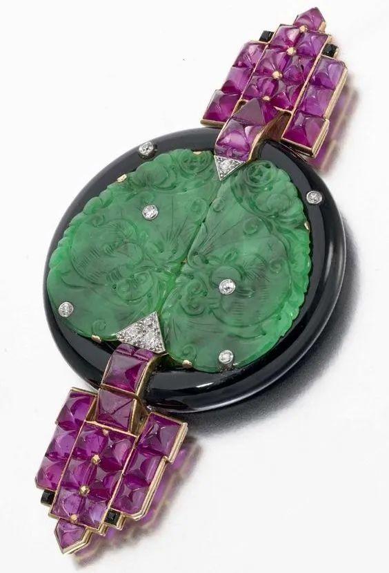 Art Deco 风格中的埃及文化、远东文化都让卡地亚痴迷,其中,在中国风的影响下,卡地亚开始在珠宝中使用了翡翠和珊瑚,翡翠比之祖母绿颜色更暖一点儿,珊瑚的红色要比红宝石柔和一些,于是,卡地亚让这四种宝石互通速配,对纹样、颜色的匹配考虑得更细致。
