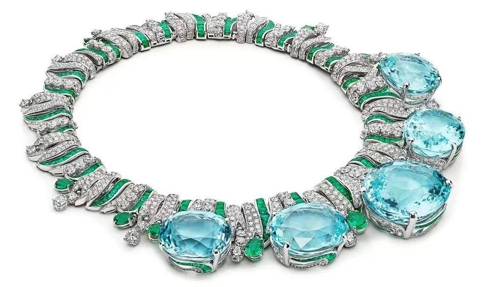 比如 Divid Morris 选择了珍稀的帕拉伊巴碧玺搭配蓝宝石,让轻盈剔透和沉稳深邃结合在一起,让人联想到深深浅浅的大海。而宝格丽则大手笔地用 5 颗重达 476.82 克拉巨大的帕拉伊巴碧玺和祖母绿搭配,则展现出生机盎然的 Style。