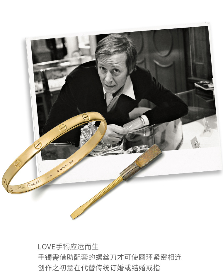 卡地亚LOVE手镯:经典的品手镯非卡地亚LOVE手镯莫属,诞生于1969年的LOVE手镯已经有50多年的历史。LOVE手镯是鬼才设计师Aldo Cipullo的梦想传奇作品,是简洁匀称的艺术珍品,获得了众多的粉丝喜爱,而且经久不衰。
