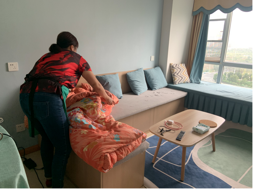 卧室比较简单,东西也不是很多,阿姨简单擦拭除尘之后,把被子整理了就OK啦。