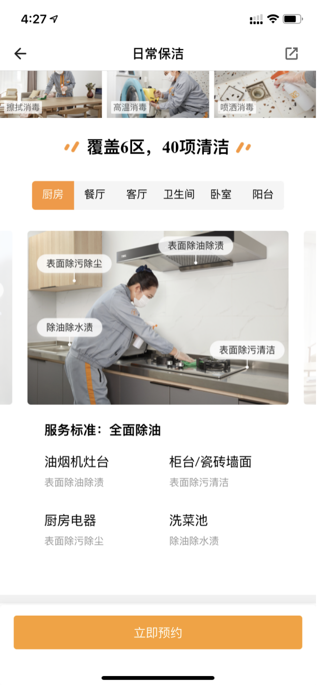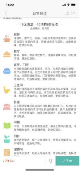 App上标注的“日常保洁”服务范围包括:厨房、餐厅、客厅、门厅、卫生间、卧室、书房、阳台、储物间,写的比较细致。