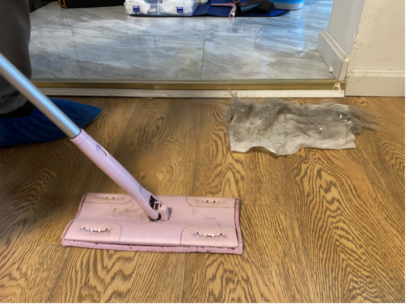 除了灰尘,还有很多大颗粒的杂质,卡在缝隙中很难被扫把完全清扫出来,所以阿姨借了小伙伴家的吸尘器,不过果一般,但阿姨还是用湿布尽力擦拭干净了地板表面。