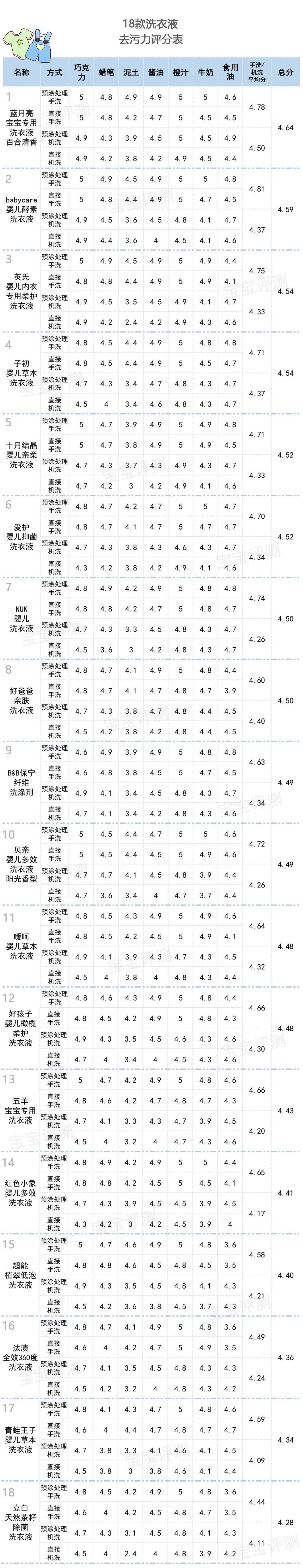 后,还要强调的是,从本次评测的结果来看,18款洗衣液之间的差距不是大,分差比较接近。所以,除了以上5款推荐产品供参考之外,其他洗衣液宝妈们也可以根据需求、喜好、价格等因素来选择,也不必太纠结。