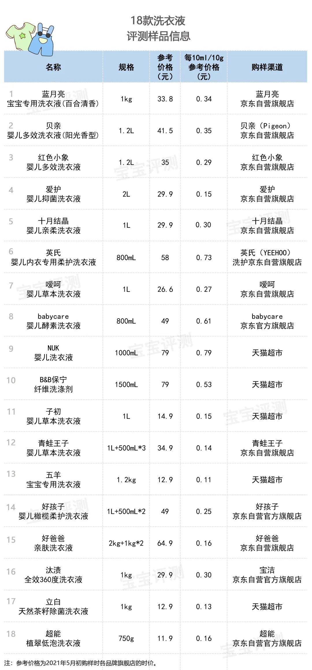 评测样品&指标本期评测的18款洗衣液品牌包括:蓝月亮、贝亲、红色小象、爱护、十月结晶、英氏、嗳呵、babycare、NUK、保宁、子初、青蛙王子、五羊、好孩子、好爸爸、汰渍、立白、超能。