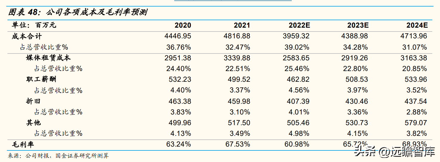 3)折旧:该项成本主要来自媒体资产,公司媒体资产折旧为 3-5 年,残值率为 0%,在不大批增加点位及更换设备的情况下,预计折旧数值较稳定。1H22 折旧成本同比-7.4%,占收入比重 3.6%,预计全年折旧成本占收入比重 4.0%;23-24 年折旧占总营收比重随营收增长而有所下滑,预计分别为 3.4%/2.9%。