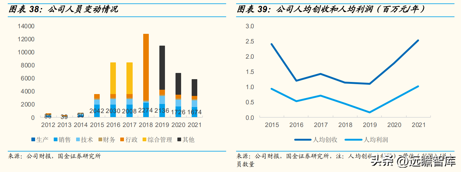 公司人员于 2015、2016、2018 年增幅较大,主要增长的人员分别是生产、综合管理和行政。2019 年以来,公司人员优化,主要体现在员工总数精简,直接创收的销售人员数量增长。优化后人均创收和人均利润均有回升,体现出人比的提升,一定程度展现出公司销售团队实力强劲。