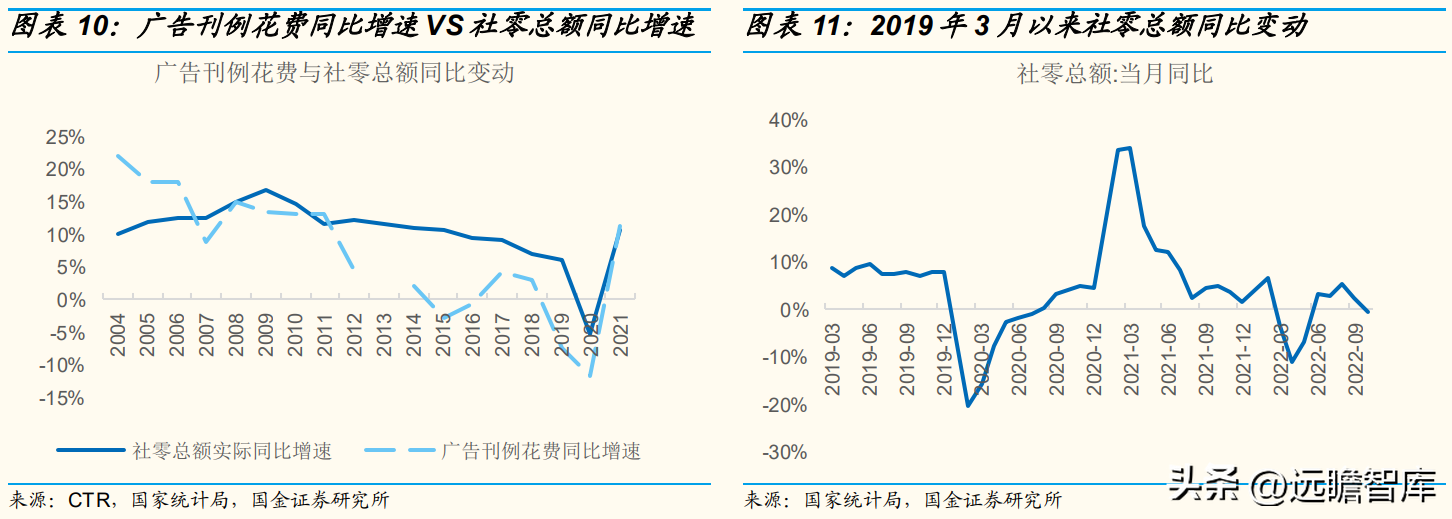 广告刊例花费与社零总额息息相关,疫后消费复苏有望推动广告投放增长。拉长时间线看,广告刊例花费与社零总额变动整体一致,尤其是 18 年以来,此时梯媒发展较成熟。