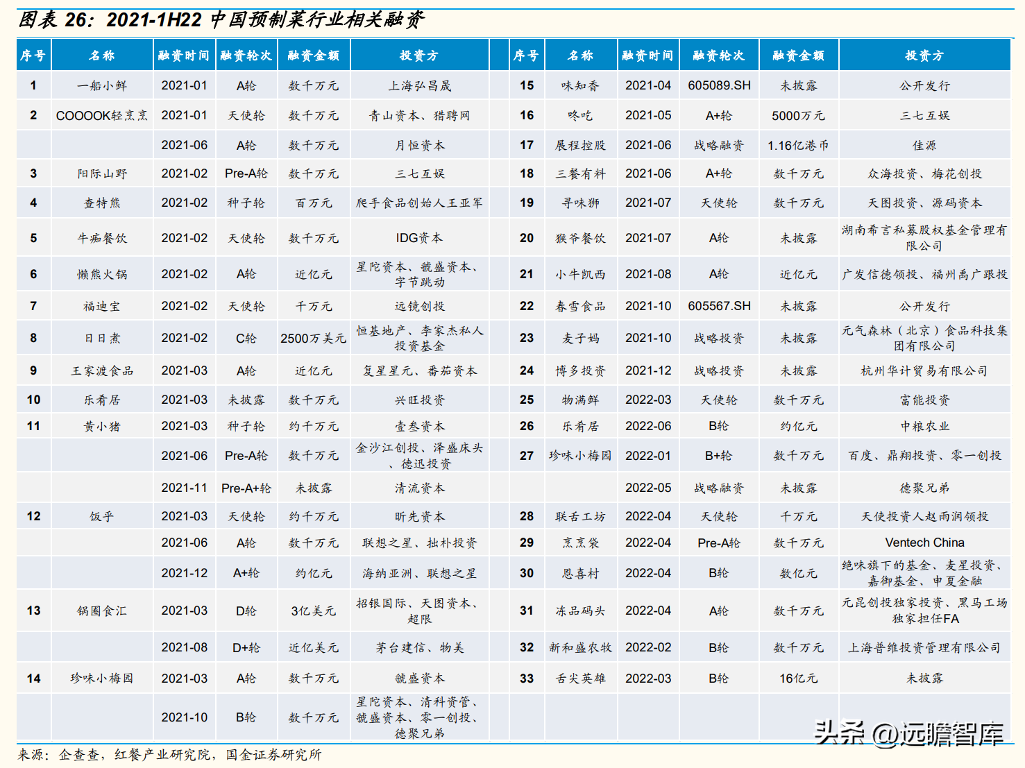 从投融资看,21 年较集中,不完全统计下,中国预制菜行业相关投融资的品牌有 24 个,22 年上半年 9 个。