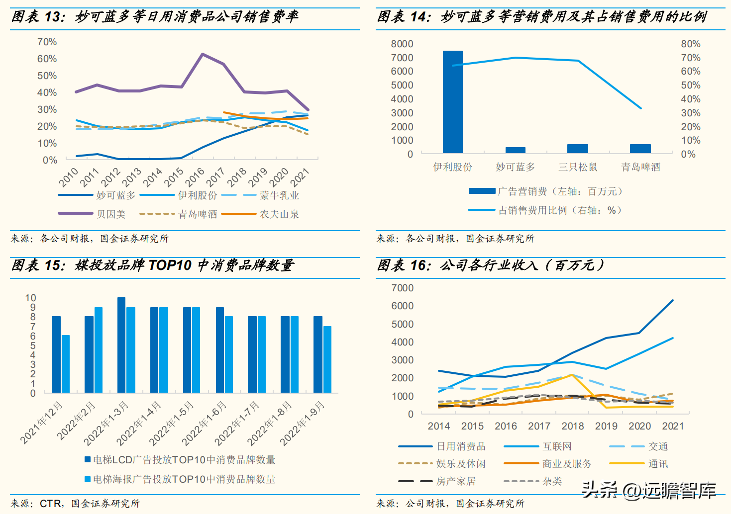 以代表性食品饮料公司为例,近三年妙可蓝多、伊利股份、蒙牛乳业等消费品牌的销售费率均在 20%以上,其中,有些公司的营销费用占比销售费用比例超 60%。CTR 数据显示,21 年 12 月以来,梯媒广告投放 TOP10 品牌中,消费类占比 80%左右。
