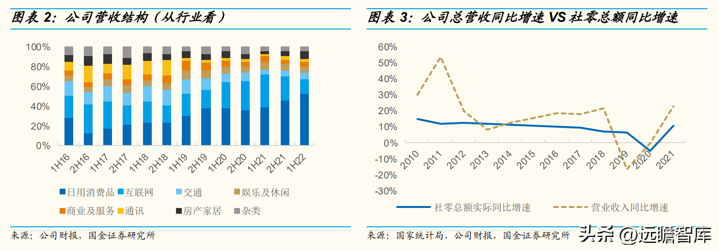 日用消费品是基本盘,公司总营收与社零总额同比变动一致,彰显消费属性。
