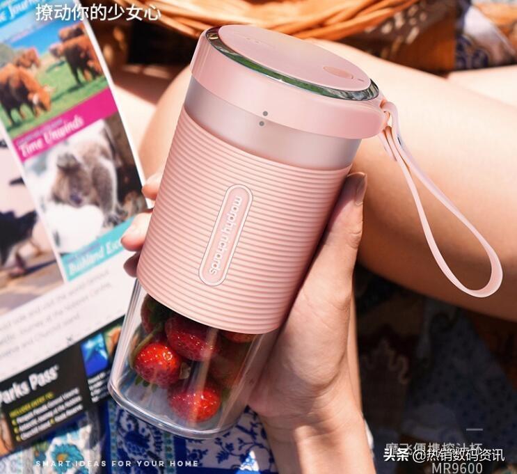 第二款:摩飞便携榨汁杯MR9600此刻摩飞便携榨汁杯MR9600外观颜色有三个:雅粉色,椰奶白,轻奢蓝,其外观便携方面还是很有科技感,十分轻便方便携带,很适合办公室,宿舍,旅行等场合使用,随时随地,放入水果就可以鲜榨!可以手动,也可以自动清洗,轻松。
