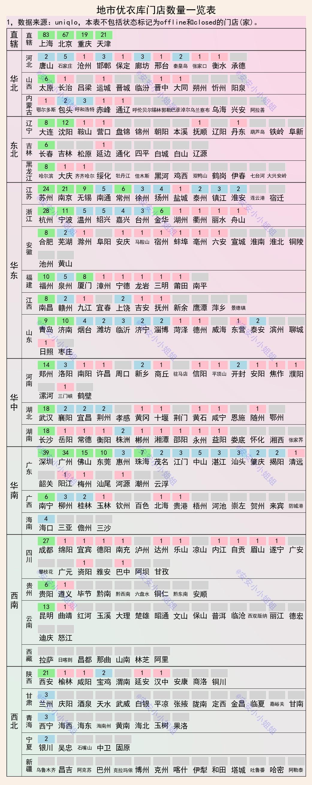 按照城市所在区域和省份,将城市的优衣库门店数量标记在图表中。