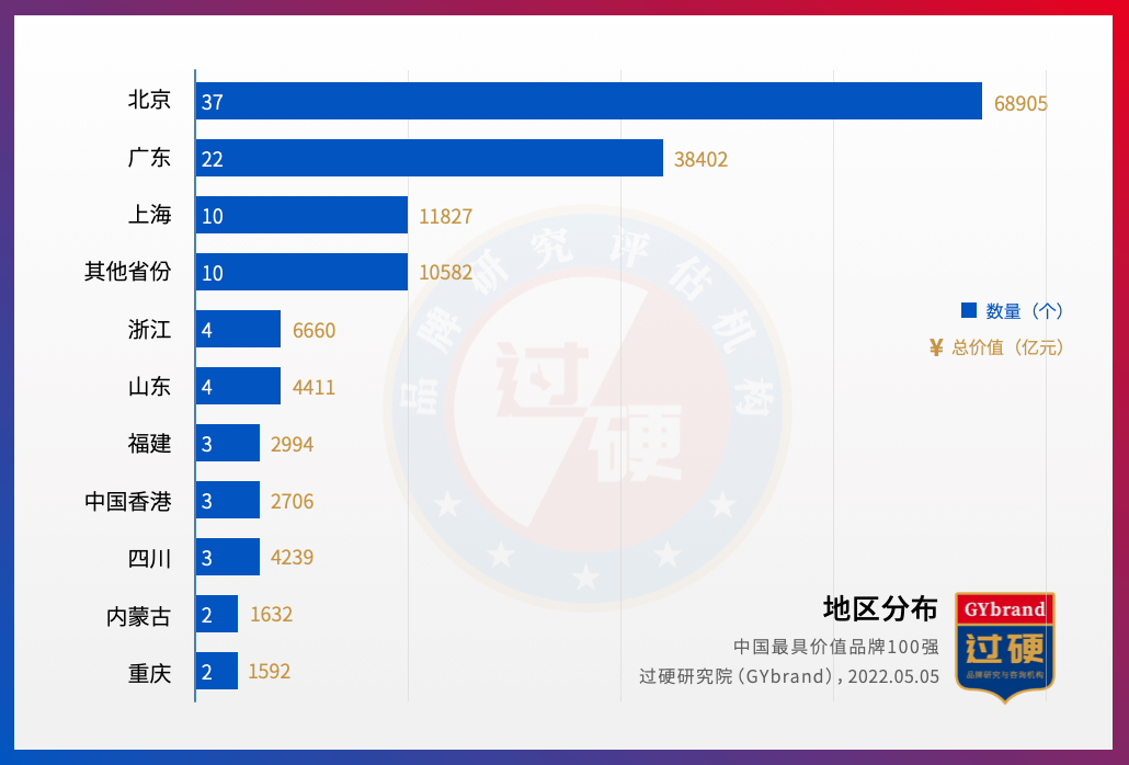 据过硬研究院统计,入选2022年中国具价值品牌100强名单的企业价值合计1539.5亿元,千亿级以上品牌47个。以下是本年度具价值中国品牌100强排行榜各地区分布情况,一起来看看有哪些行业龙头企业入选吧。