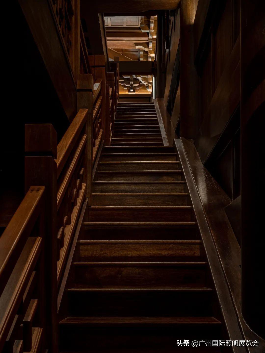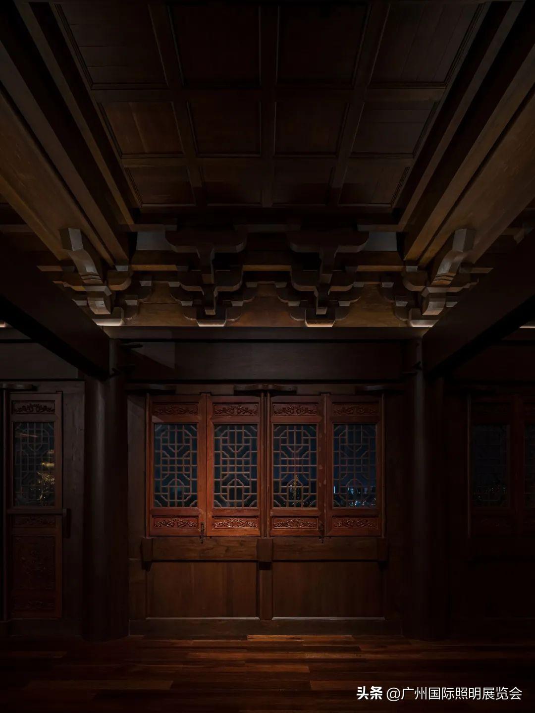 表现传统建筑空间细节的美,照明手法上不能在视线上出现直视光源,主要采用间接照明的手法尽量隐藏灯具。像每层的天花斗拱,是用光向上洗亮层层斗拱,弱化出光面。再通过斗拱的二次漫反射将光散到空间中去。从一层到顶部藻井的光层层向上,也寓意这佛法的高不可观,灯灯相传。