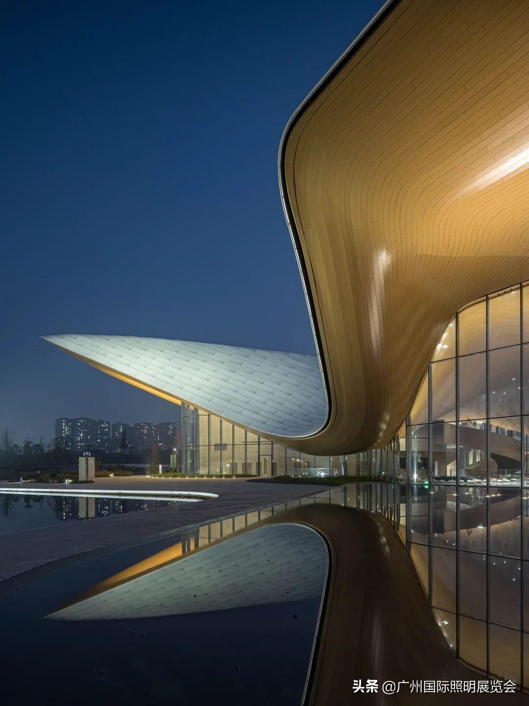 美术馆的屋顶造型如同一朵巨大的芙蓉花漂浮在水面上,寓意是出水芙蓉境。蜿蜒起伏的白色屋面采用4000k的色温犹如月光洒落在花瓣上洁白圣洁,暖色的竹皮材质通过3000k的灯光烘托,暖色的光线由内向外散出给人温暖的感觉。