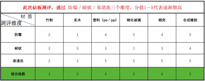 稻壳菜板综合指数:4星 。 防霉性:4星;耐砍性:3星;易清洗:5星