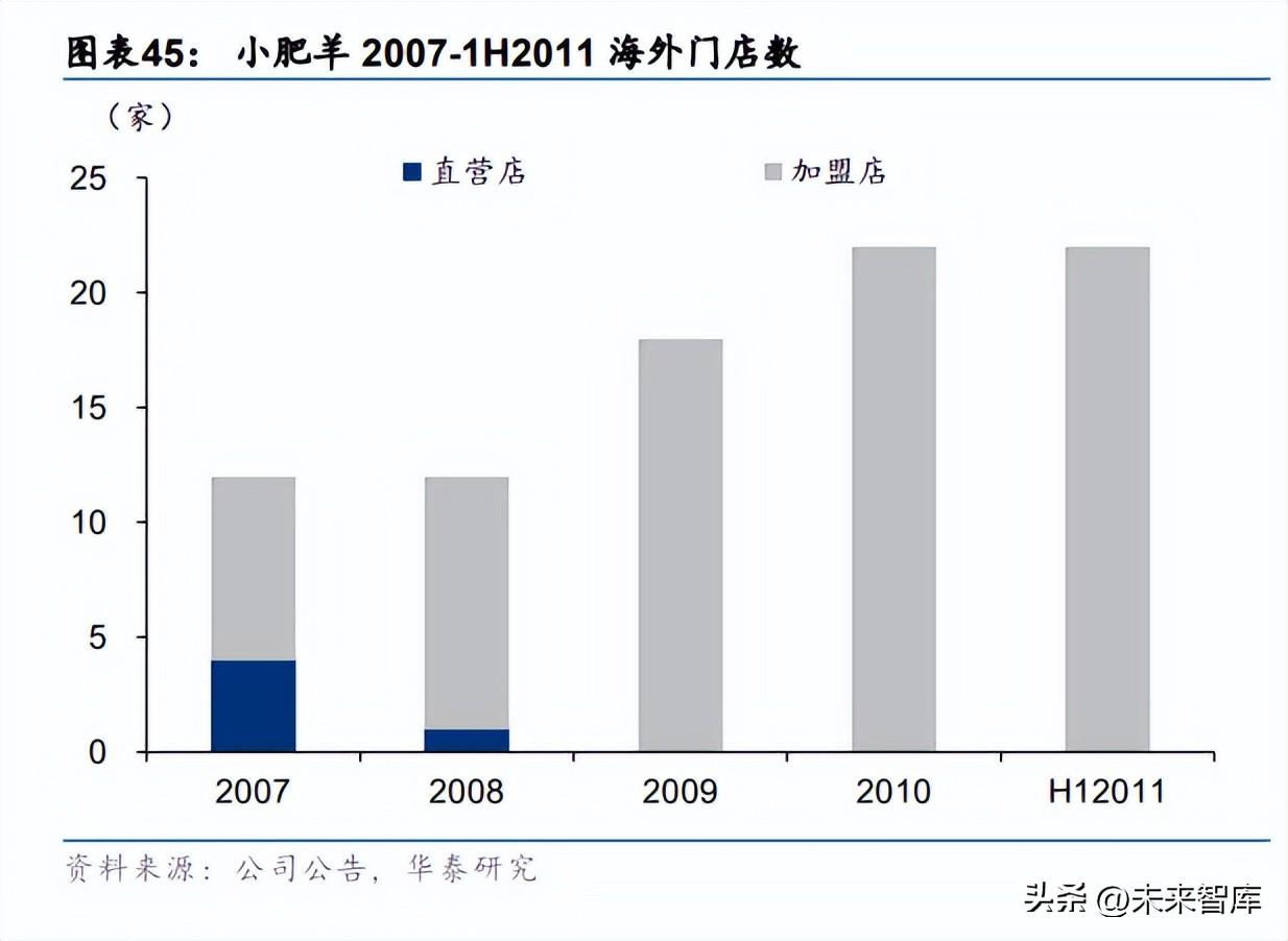 小肥羊具有超前的国际化运营思维。早在 2003 年 11 月,小肥羊海外门店已在美国洛 杉矶开业。2005 年,小肥羊在加拿大成立合资公司,专注发展国际业务,同年海外直 营店开业。2006 年,公司引入欧洲大风投集团 3i 集团和 Prax 资本两大外资机构,汉堡 王和肯德基高管加盟独立董事,国际化人才资源得到补充。2008 年,公司登陆港交所成为 中式火锅第一股,以香港为桥头堡继续进军海外。2011 年,小肥羊被百胜集团私有化。小 肥羊一系列国际化和资本运作,为其在海外运营提供了强有力的支撑,使其快速成长为具 有国际化视野的跨国餐饮品牌。截至 1H2011,小肥羊在海外拥有 28 家门店(后因小肥羊 私有化,不再公开披露海外门店数)。