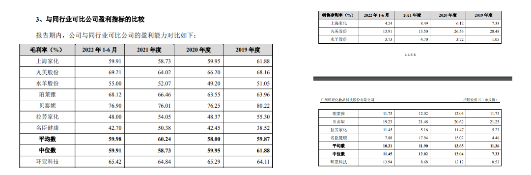 据环亚科技列出的国内化妆品可比公司数据,环亚科技2019-2021年的毛利率均高于平均毛利率和中位数。