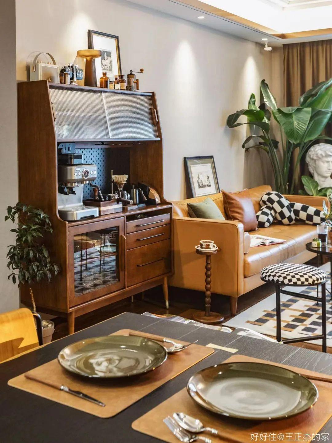 △ 住友@王正杰的家:前不久调整了家具格局,也新增了一些家具,朋友来家里说我是不是换了一个家。其实这次变动较大的就是换了窗帘和窗边的一排家具摆放,另外也添置了一个新的餐边柜,确实看起来家里瞬间变样了。因为餐边柜刚好在我家中心的位置,占据 C 位后,对整体的风格影响还是蛮大的。原本的这里是一个极简风格的长虹玻璃高柜,没有太的风格,视觉中心被客厅的大卫像吸走了,这次一换餐边柜,视觉中心就集中在这里的,刚好一进家门就能一眼看到。其实我之前就一直想要一个双层的餐边柜,但餐厅空间有限,实在放不下,就只入了一个小斗柜来放咖啡机,近转念一想,餐边柜不一定要放在餐厅,在客厅做个咖啡角也不错,加上近开始布置客房了,里面缺一个柜子,就把外面的玻璃柜拿进去了,这个空出来的空间刚好可以放个高柜子。其实自己更喜欢一米八的大柜子,但是确实家里没地方放了,后就选了这个 1.2米的,原本沙发边只有1米的位置,为了放柜子,就把沙发往右推了 20cm,虽然这样沙发和电视柜有点不对齐了,但这个柜子短只有 1.2 米的版本,自己又很喜欢,就妥协了不对齐这一点,因为只有 20cm 的差距,视觉上看起来也还可以。加了这个柜子以后,我就把原本餐厅的咖啡角搬过来了,把杯具餐具都装了进去,解放了很多空间。柜子右侧有三个抽屉,刚好也可以放咖啡相关的小东西,左侧的玻璃柜门,也可以放一些餐盘杯子,顶部还有玻璃的移门柜,用来放好看杯子就很有氛围感。柜子背景是洞洞板,也有滑轨插座,也很适合放咖啡机!新的柜子也是复古调调的,做旧木材的质感就很符合现在家里的风格。自从家里复古风格慢慢形成以后,也在努力往这个方向偏,换掉了很多早期不怎么复古的家具,小东西也换得越来越复古,这次干脆换了个大件,打造完新的咖啡角,朋友也说我家像是复古咖啡馆!今天就分享我的新餐边柜,大家觉得适合我家吗?新的折腾还在继续,近也是集中在客房布置,有进展了我再和大家分享哈,那我们就下期再见了!