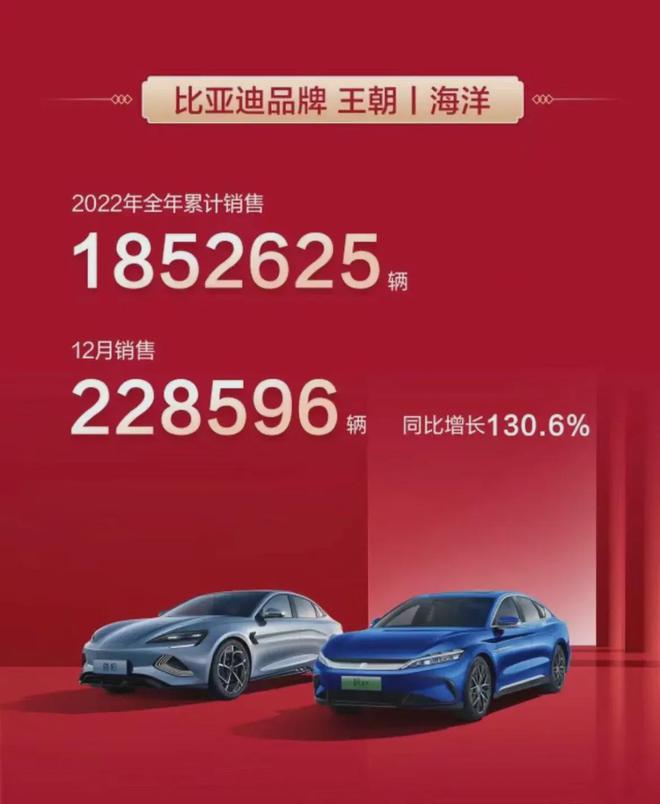 具体到品牌,王朝、海洋网车型在2022年累计卖出了185.26万辆,占比近87%,是目前销量贡献的主力。具体到车型,就包括了宋、秦、唐、汉、元PLUS,以及海豹、海豚、驱逐舰等热门车型。