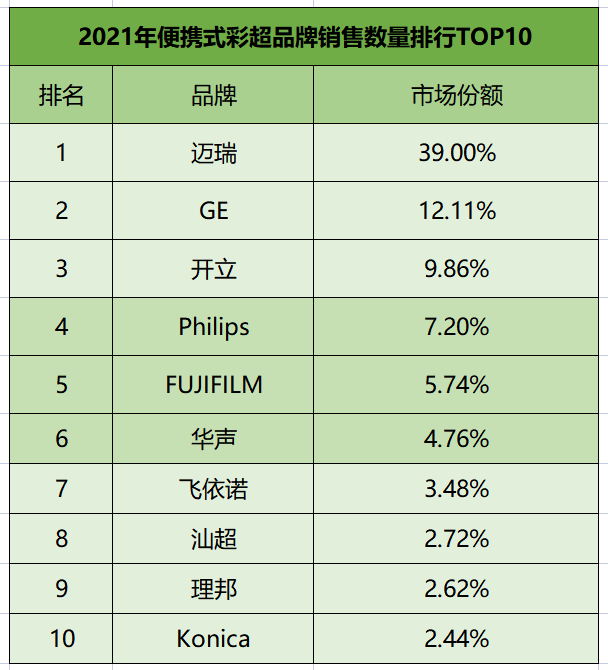 医招采数据显示,在2021年台式彩超的品牌销售数量中,迈瑞以26.91%的市场份额位列第一,GE以20.77%的市场份额紧随其后,飞利浦以18.67%的市场份额位列第三。此外还有开立、日立、西门子、三星、佳能、飞依诺、汕超七家企业进入排行榜前十。