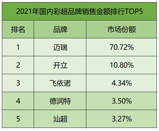 在彩超的品牌销售数量上,迈瑞、开立、飞依诺、汕超、华声分别以60.97%、12.95%、4.8%、4.3%、2.97%的市场份额位列国内超声前五。其中,迈瑞以60.97%的份额获得了的市场占有率。